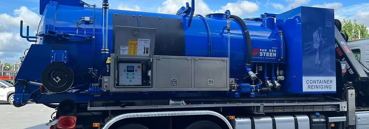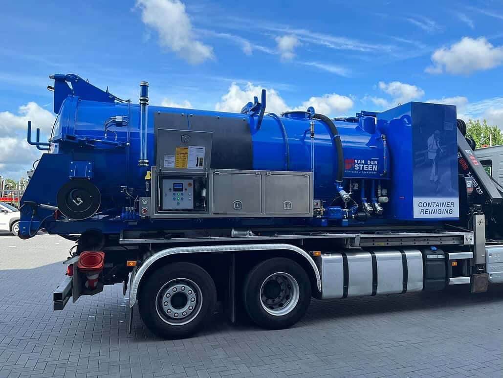 Ook is er een nieuwe reinigingsunit geleverd. Deze unit is ingericht met vacuümpomp en een hoge druk pomp. Met deze unit kunnen we op een specialistische manier de betonputten van de ondergrondse containers reinigen en ontdoen van afval en afvalwater. Er is gekozen voor een afzetsysteem, zo blijft ons voertuig flexibel inzetbaar.